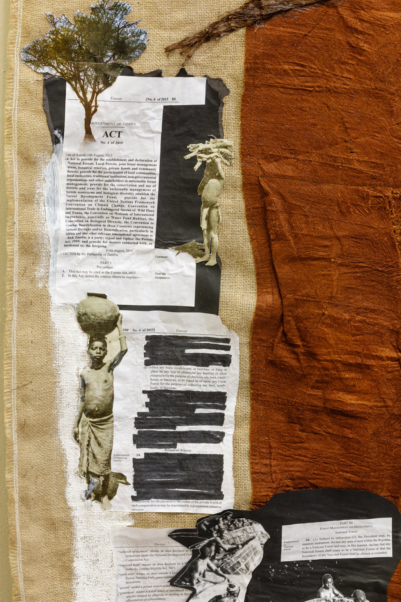 Isaac Kalambata’s collage work Mizyu (2025) seems to be a curatorial illustration of the impact of lawful immorality. Kalambata’s work showcases Zambian legislation on forests and property laws (No. 4 of 2025) with the word “DISPLACED” stamped in red on top of copies of the legislation, illustrating the ways in which the corrupt force of law has brought the displacement of Indigenous populations. The work is accompanied by photographs of what appear to be natives and their belongings. In the center of the piece, we see Mwendanjangula, the “Lord of the Forest,” with his hands tied behind him, eternally attached to a tree. The metaphor touches on the continuous battle between “development” in the eyes of the capitalist beholder and violence in the eyes of the subjugated. Mizyu draws inspiration from the Witchcraft Act of 1914, “a legislation that expressly sought to entrench the colonial Christian church by curtailing alternative spirituality and healing practices within what is now Zambia.” Colah, with the choice of this work, seems to criticize a porous distinction between “this is law” and “this ought to be law.”